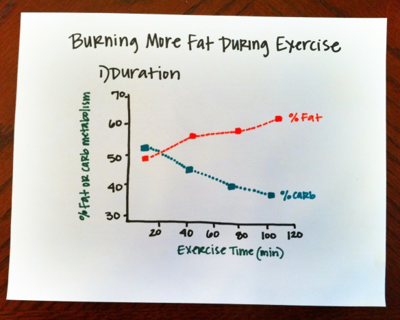 The dotted line is for a normal person. He starts burning fat at the 40 minute point when his blood sugar starts rising. The solid line is for the diabetics who continue to burn carbs and sugar until the 90th minute. This is because if you have high blood sugar then exercise will burn that first. The clearest illustrations I have seen which help us to determine when fat is burnt and when carbs are burnt are these two hand drawn graphs...